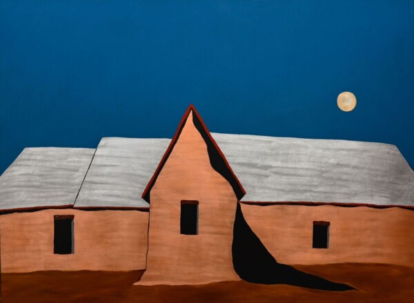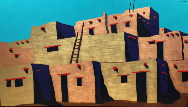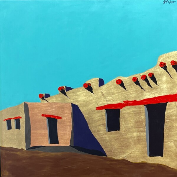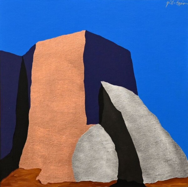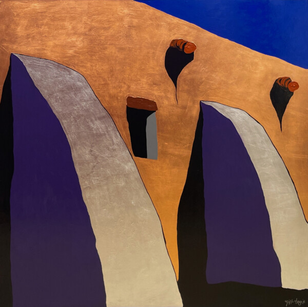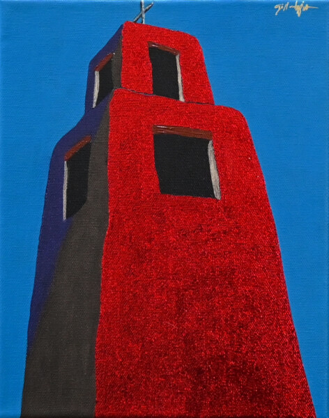 Born in Santa Fe, descendent from generations of New Mexican ranchers, Gill-Tapia’s many life experiences have culminated in his current paintings: The Architectural Series. A precocious talent in drawing, photography, weaving, and ceramics opened the door for him, to a four-year long association with his mentor, Belgian weaver and painter, Maud Henon (UNESCO RECIPIENT for her Tapestry Work). Myriad studio hours, artistic guidance, and numerous trips to the studios and museums of Brussels, Bruges, Amsterdam and Paris while under her tutelage, further developed his skills, and firmly planted him on this lifetime path. Ten years in New York City followed. Classes in painting, drawing and anatomy from the masters at The Art Students League of New York, The New York Academy, and the National Academy of Art. Gill-Tapia served as monitor, as well as teaching classes to both youths, and adults during this period. He later maintained a studio in the city, taught privately and showed at many art galleries and public art venues in NYC. Today, Gill-Tapia has returned to his native Sangre de Cristo Mountains, and lives and paints in his beloved Santa Fe. The Southwest provides the inspiration, subjects and light that are his work. His century old familiar roots, tracing back to Madrid, bind him to those architectural traditions of the great masterpieces of Hispanic art: The buildings in New Mexico, Arizona and California are his constant inspiration. He has photographed and sketched them devotedly, eventually evolving his present semi-abstract, yet three-dimensional style. For emphasis and contrast, he places these often fragmentary, often complete images against stark monochromatic skies.