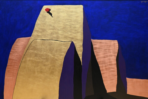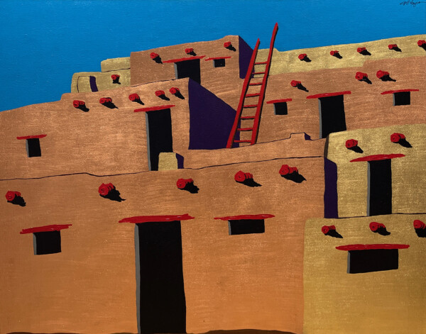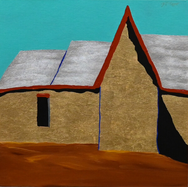 His June 3, 2022 show at Manitou Galleries in Santa Fe, New Mexico includes large and small pieces with a unique perspective from both above and below the Adobe structures that he favors in this body of work. He continues with an emphasis of the various leaf metals of gold, copper and silver, giving his work the visual effect of shine and movement. Viewers concentrate with intrigue and are attracted to the visual dynamics.