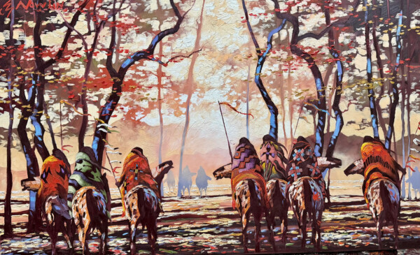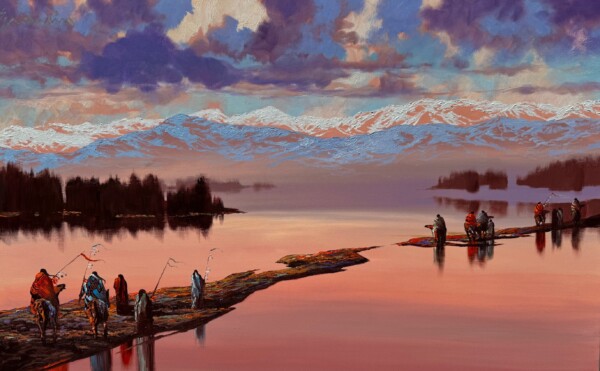 B.C. Nowlin’s paintings reflect his cross-cultural background. Born and raised in New Mexico, his family’s land formed the southern boundary of the Sandia Pueblo Reservation.