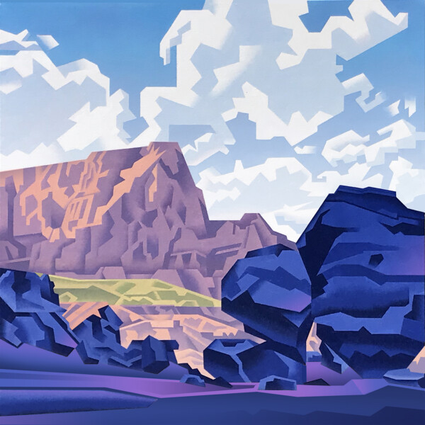 Equally inspiring for Jonason are two seemingly disparate influences: the traditional arts and crafts of the Southwest’s native tribes, and the intricate large- and small-scaled geometric patterns that occur in nature, known as fractals. Yet, their connection quickly becomes clear in speaking to the artist about how he sees the world. “For me as a painter, it’s all about volume and shape, a reductive and simplifying process of finding the natural geometries in nature,” he says. “And that’s no different than the way Navajo weavers or Pueblo potters portrayed the natural world through geometric series of zigzags, curves, or other patterns.”
