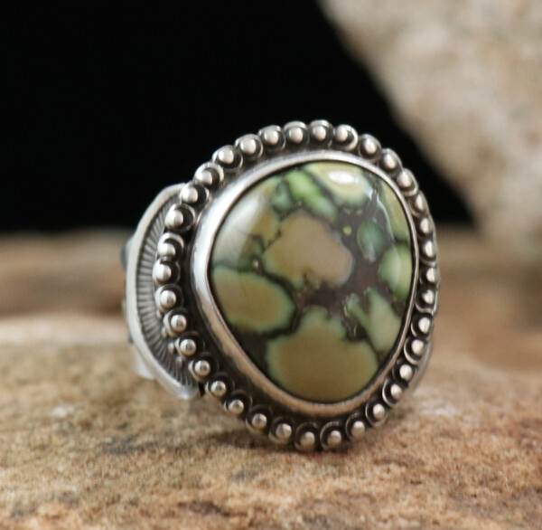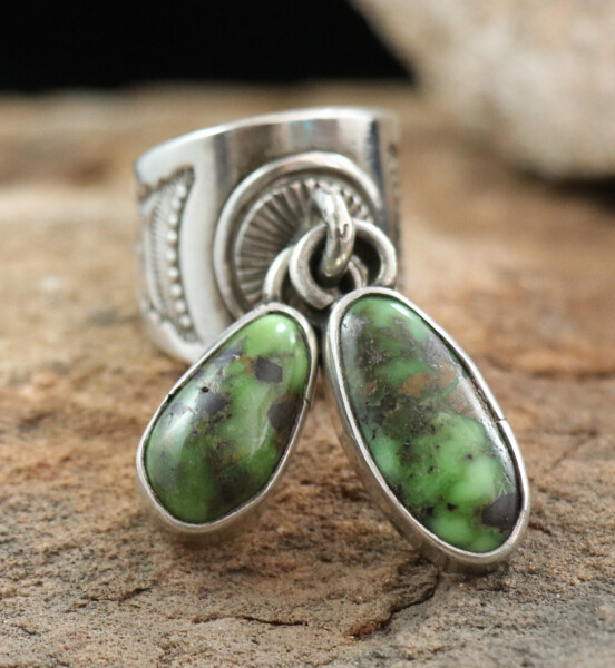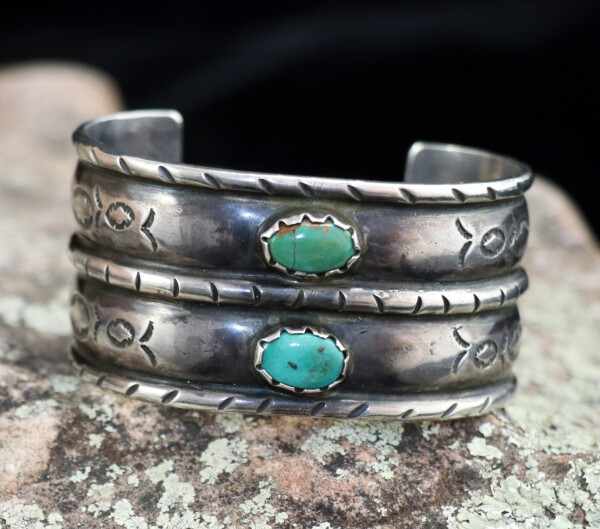 Ingot Silver cuff w/ Chiseled & Stamped Bands, 5 Cerrillos Turquoise Cabochons, & 12 Silver Raindrop AccentsJEWELRY COLLECTOR’S ROOMPalace Jewelers