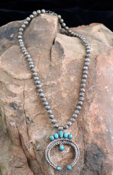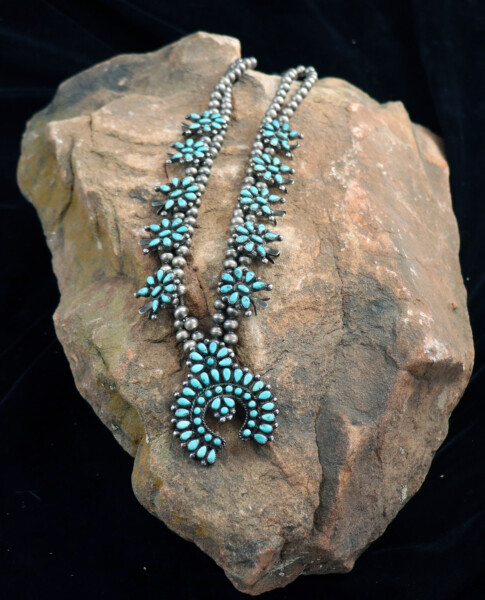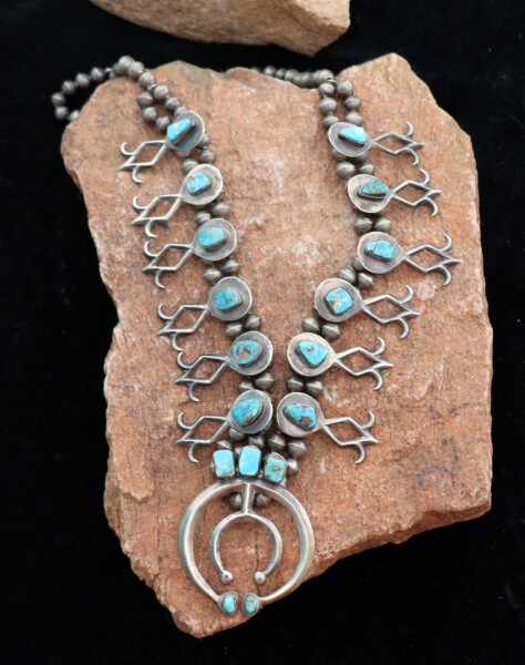 Silver & Turquoise Squash Blossom Necklace w/ 12 Blossoms in the Fluer De Lis DesignJEWELRY COLLECTOR’S ROOMPalace Jewelers
