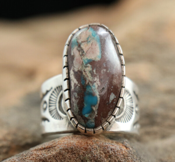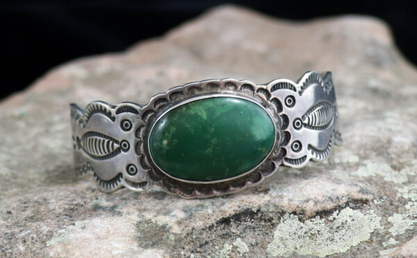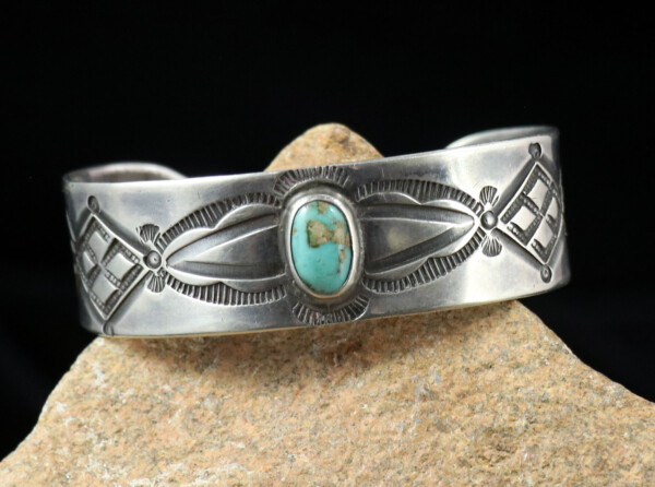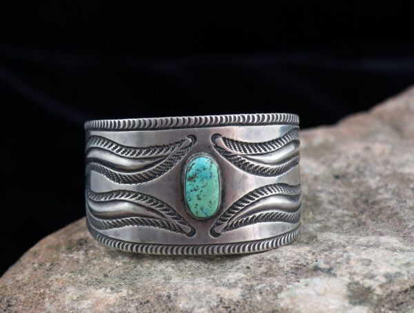 Large Navajo Split Design & Silver Stamping Work w/ Single Oval Cut Turquoise Stone CuffJEWELRY COLLECTOR’S ROOMPalace Jewelers