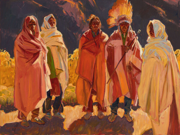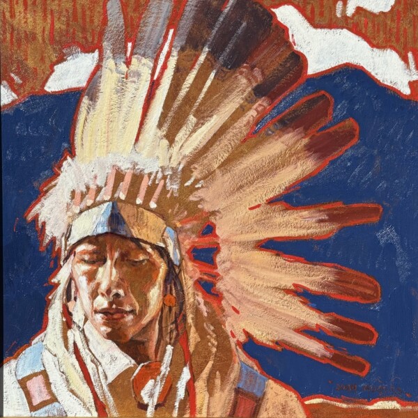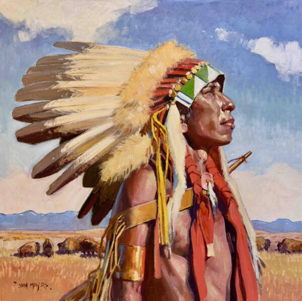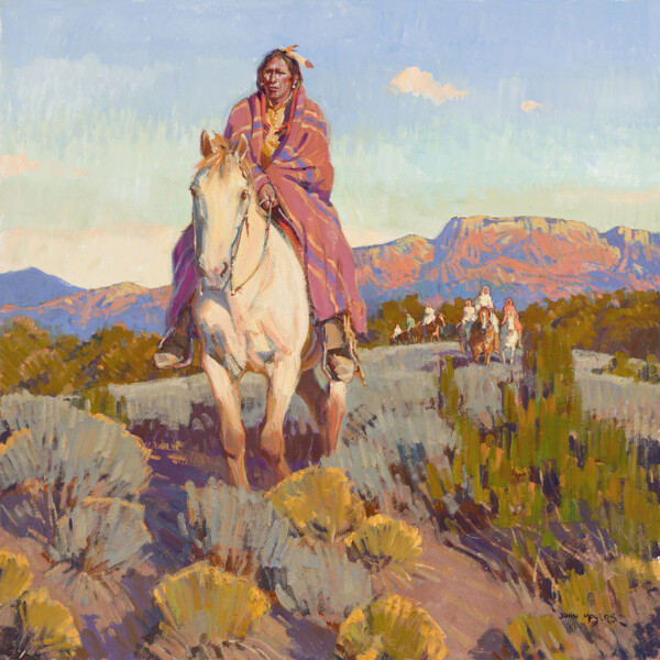 He paints Native Americans, cowboys, themes from Old Mexico and New Mexico, and landscapes. “I paint what excites me. Maybe for two months all I want to do is landscapes, then maybe Native Americans and then Mexican pieces.” Moyers also says, “The more you paint, the more comfortable you get with the process. Hopefully, I’m improving all the time.”