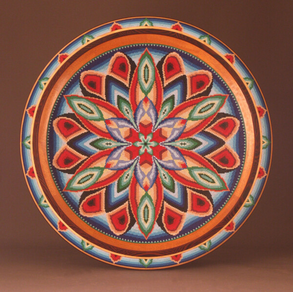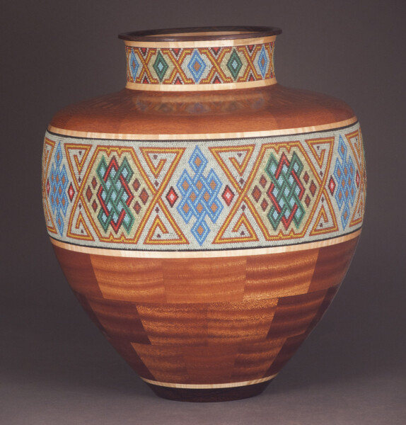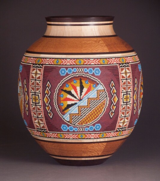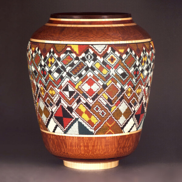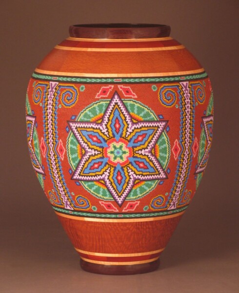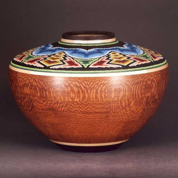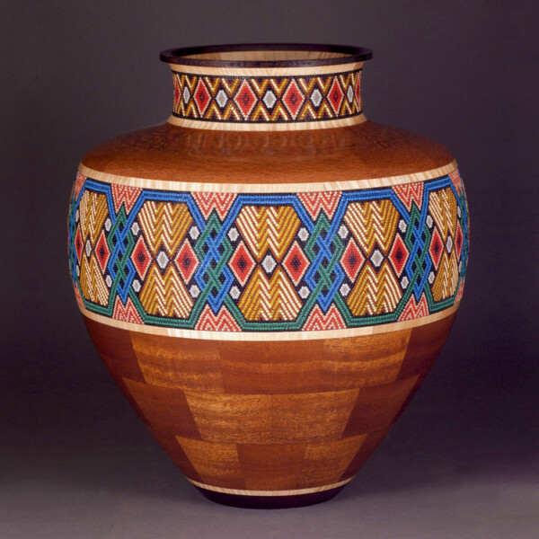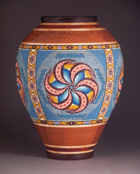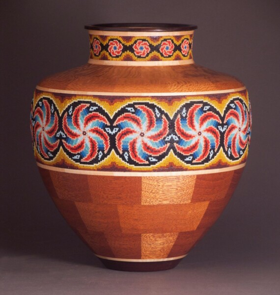 There was a woodshop at the mission where Eucled learned basic shop skills and turning from his father. Being the perfectionist that he is, he went on to refine the technique of segmented turning. Marilyn learned basic woodworking skills by helping design and construct her house when she was 19. That was it! Then she knew she loved designing and creating in wood. Her turning skills began developing when she began making high-end kaleidoscopes which were marketed at fine craft galleries across the country. Eucled and Marilyn began collaborating in 1989. It’s the first time either had a long term working relationship with another artist. Both find the partnership to be very creative and stimulating.