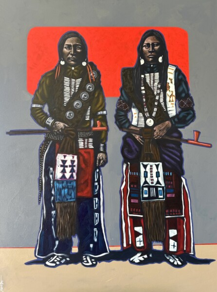 Nocona Burgess presents strikingly modern depictions of Indigenous men and women from various tribal Nations of North America. His paintings mix careful research, firsthand knowledge and raw passion. By combining brightly colored shapes with crisply outlined facial features and traditional dress, Burgess explores the cultural context, life story and identity of each sitter. In this way, the artist urges us to update our perceptions of Native people and consider the intriguing and often highly politicized place of Native American portraiture.