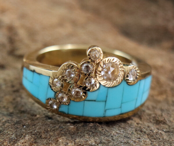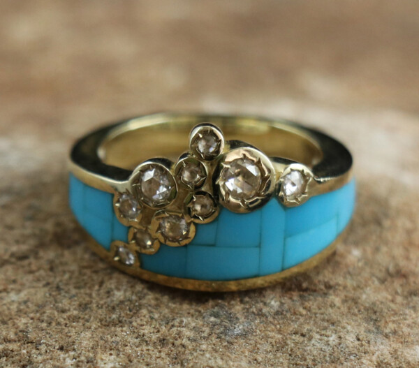 253/.22 – 14kty Medium “Julia” Inlay with Kingman Turquoise and 10 White Rose Cut Diamonds = .22cttwVALERIE FAIRCHILDPalace Jewelers