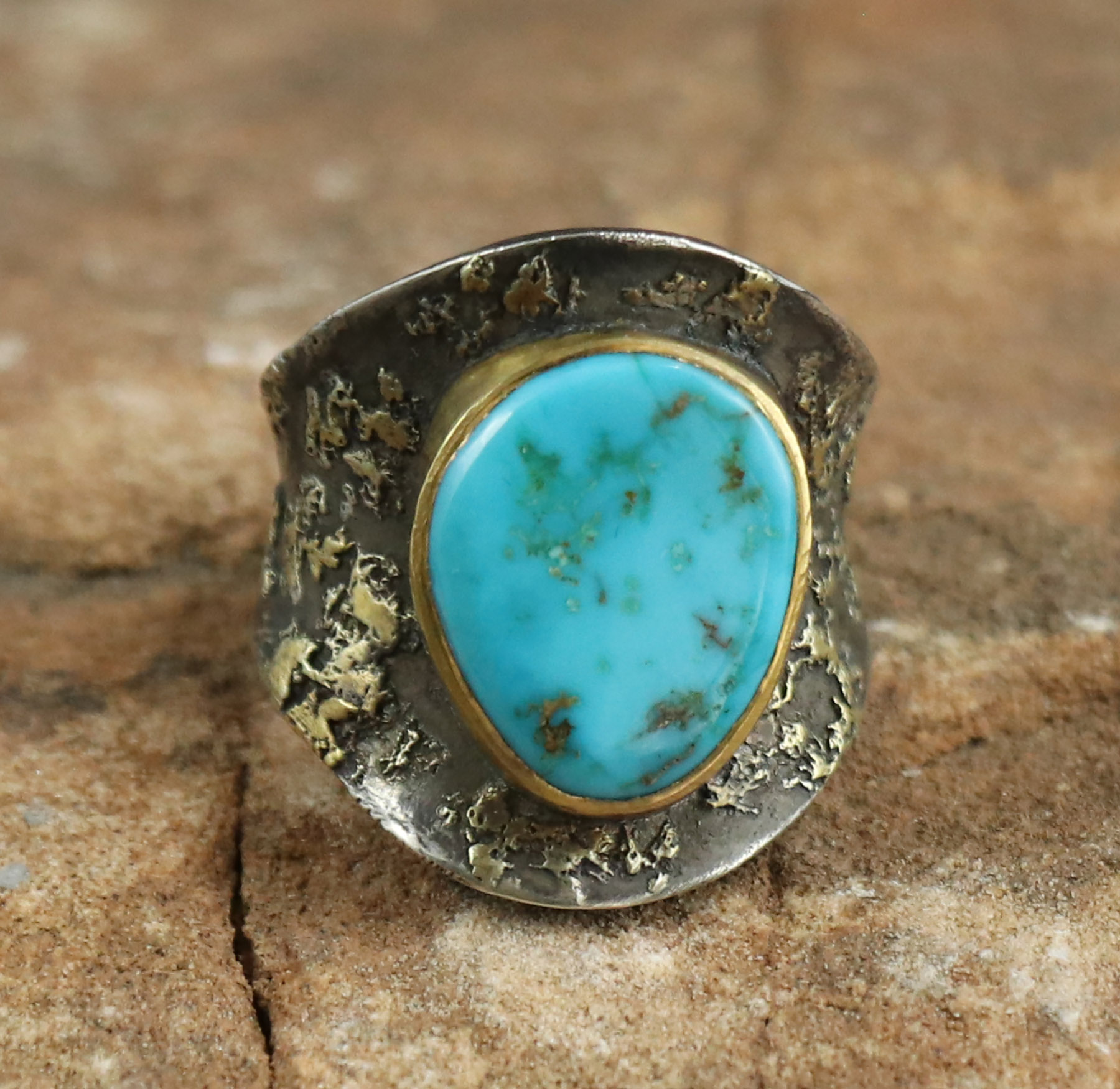 040334 Sterling Silver, 24kt Concave Gold Dust Ring with 22kty Bezel Set Free Form, Natural 5.66ct New Mexico Tyrone Turquoise