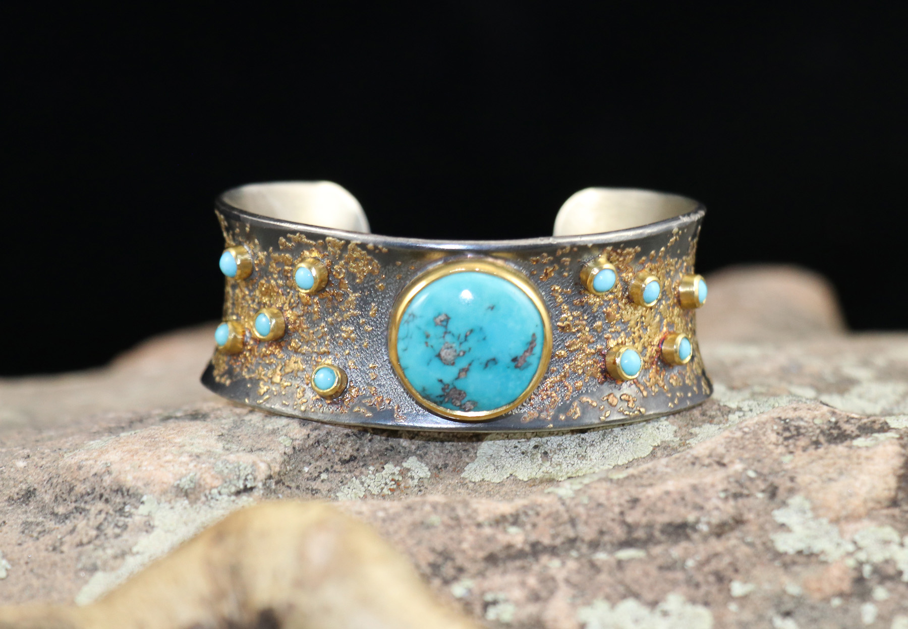 1″ Concave, Sterling Silver, 22kt Gold Dust Cuff with Bezel Set 15.72ct Round Turquoise & 10 – 3mm Rd Turquoise = 1.77cts. Total Turquoise Weight = 17.49cts