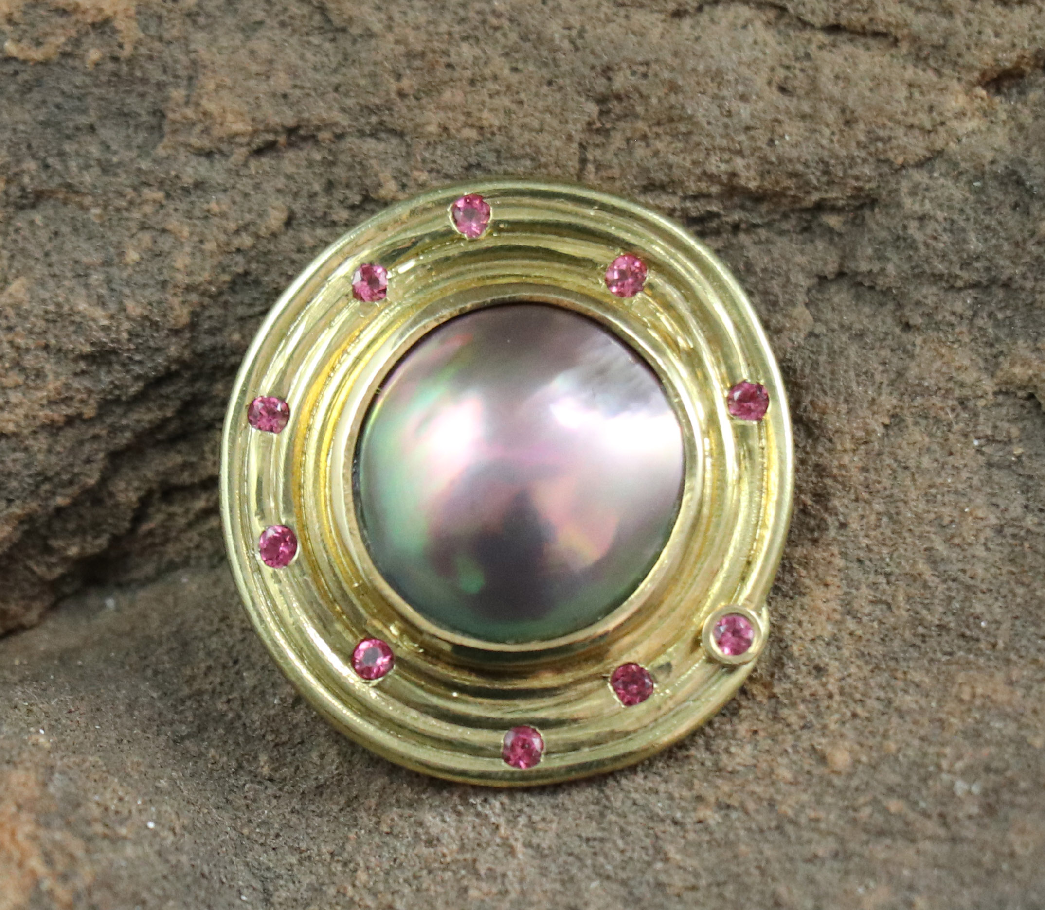 18kty Spiral Design Pendant with Sea of Cortez Mabe Pearl and 10rd. Pink Spinels = .17cttw