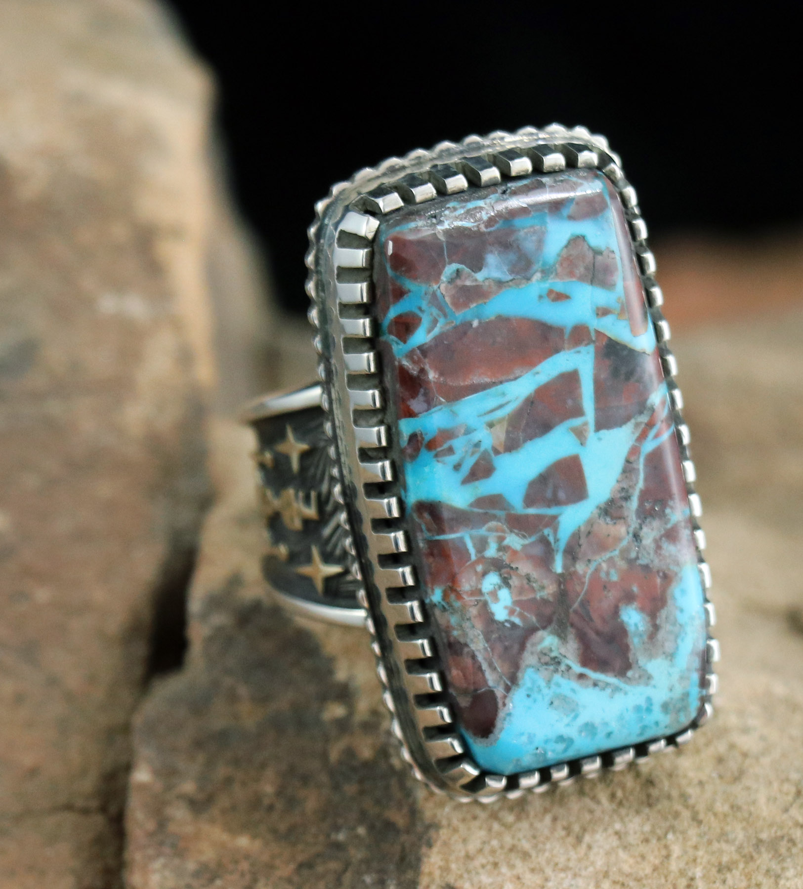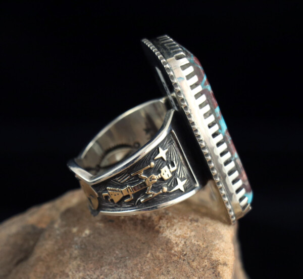 48cts Bisbee Turquoise Ring with Gold Yei’s on Side and Bear on Bottom