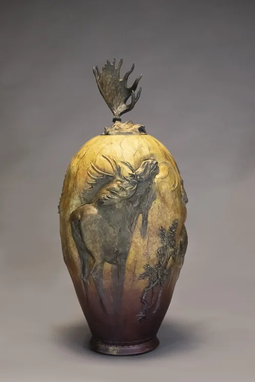 The moose draws your eyes around in an endless continual circle as oneness on the vessel. The splits and cracks symbolize the dichotomy of questions. How can a human feel like they donât belong when everything else does? Do I become one at my birth, ego, life, death, decomposition, or conception? Is this life a linear or circular event? These seeds of musing consciousness are cast in âBecoming the Mooseâ, a bronze vessel that carries psychic fertilizer.
