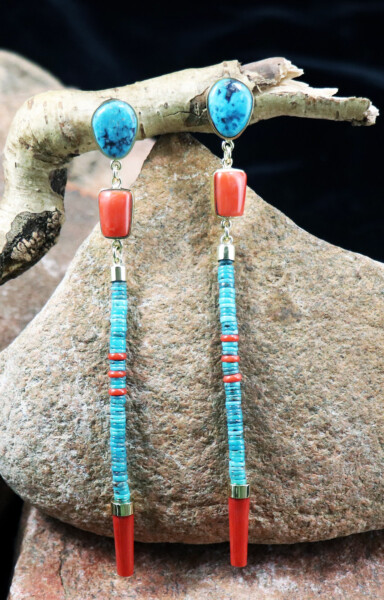 Bisbee Turquoise & Coral 18KY Heshi Dangle Earrings