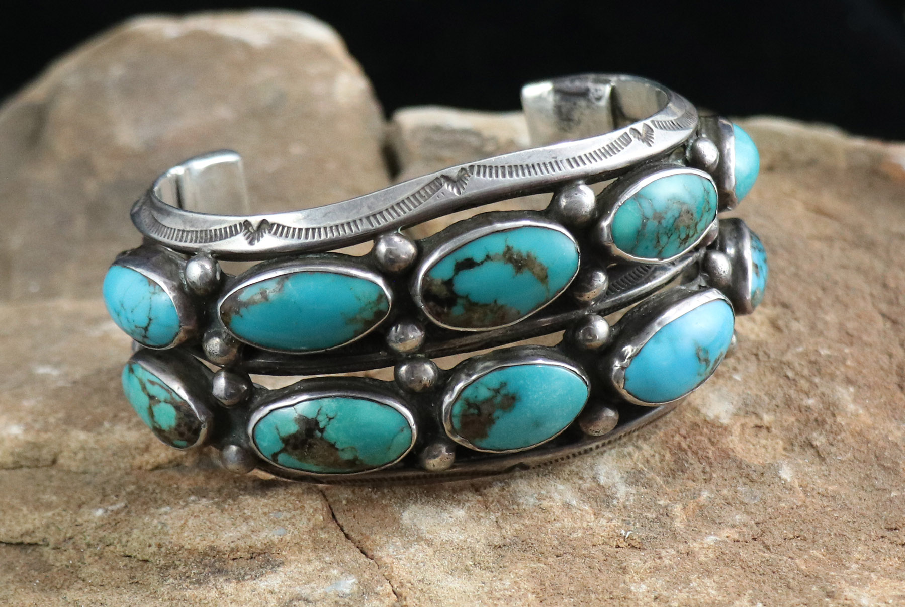 D&B – Two Rows of Ten Oval Cut Turquoise Stones Silver Bracelet