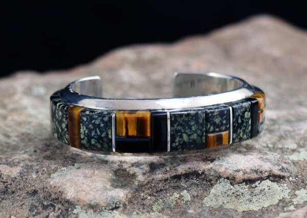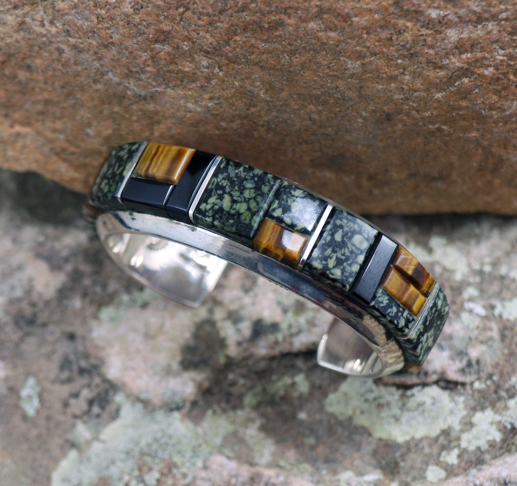 Multi Inlay Bracelet Fossilized Coral, Tiger Eye, and Onyx