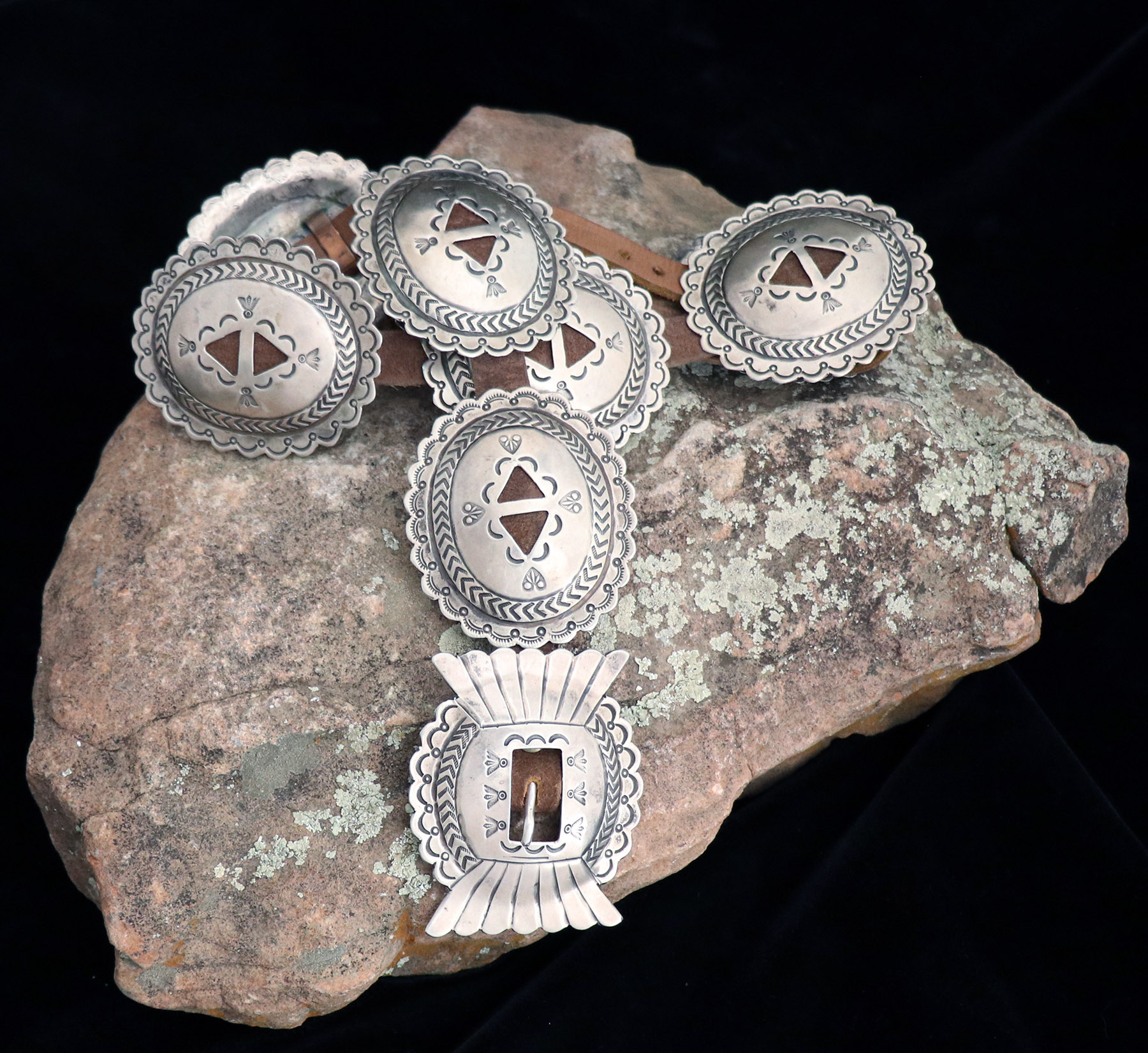 Attributed to the CG Wallace Trading Post at Zuni Pueblo. A silver concho belt