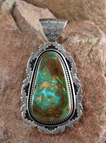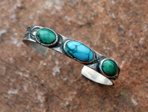 greasy green Cerrillos turquoise stones flanking a fabulous natural blue turquoise cabochon. Cuff