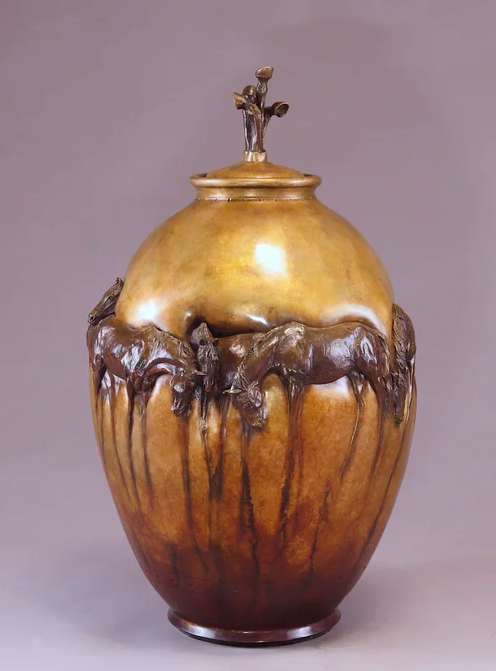 Created for his sister Beth: A story of life’s potential. When I put clay on the wheel, I feel as if Iâm aligning the whole universe in my hands! Like in Dr. Seussâs book, âHorton Hears a Who!â, I listen for something in the clay. That potential is intangible and it hangs in the center of our being; symbolized with the tethers hanging under the lid in this vessel. This bas-relief sculptural artwork on a bronze vessel looks as if the work was at one time, pliable, malleable or flexible. The egg shape is one of the most powerful designs in nature. Elongated legs of these âNine Musesâ are grounded on the form of the eggâs potential. The lid has a composition of horseâs legs running at full speed in a race.
