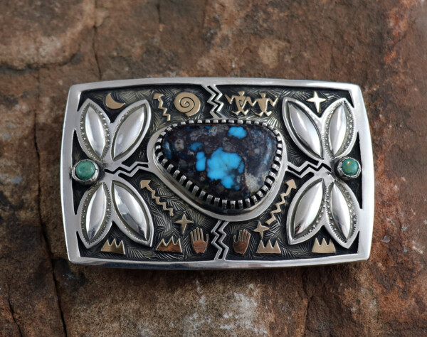 Sterling Silver and 14kt Gold Buckle with 49ct Bisbee Turquoise and Carico Lake Turquoise