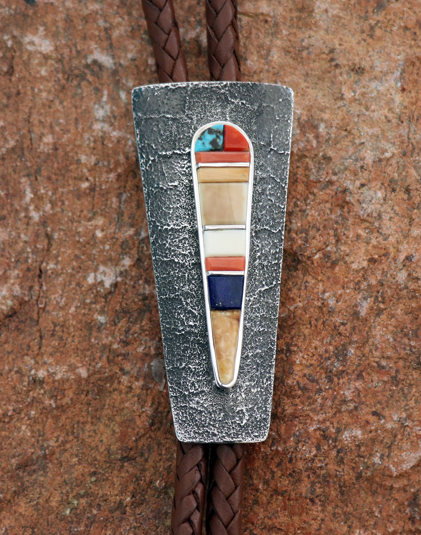 Tufa Cast Bolo with Inlaid Ivory, Turquoise, Coral, & Lapis